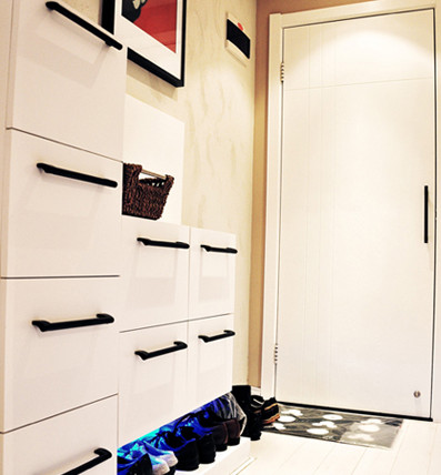玄关的一角处,白色条状的整体鞋柜,自上而下贯穿正面墙壁。将不经常穿的鞋子放在柜子里,常用的鞋子放在柜子下面的空档处。不仅节约了空间,而且便于拿取,一举两得。